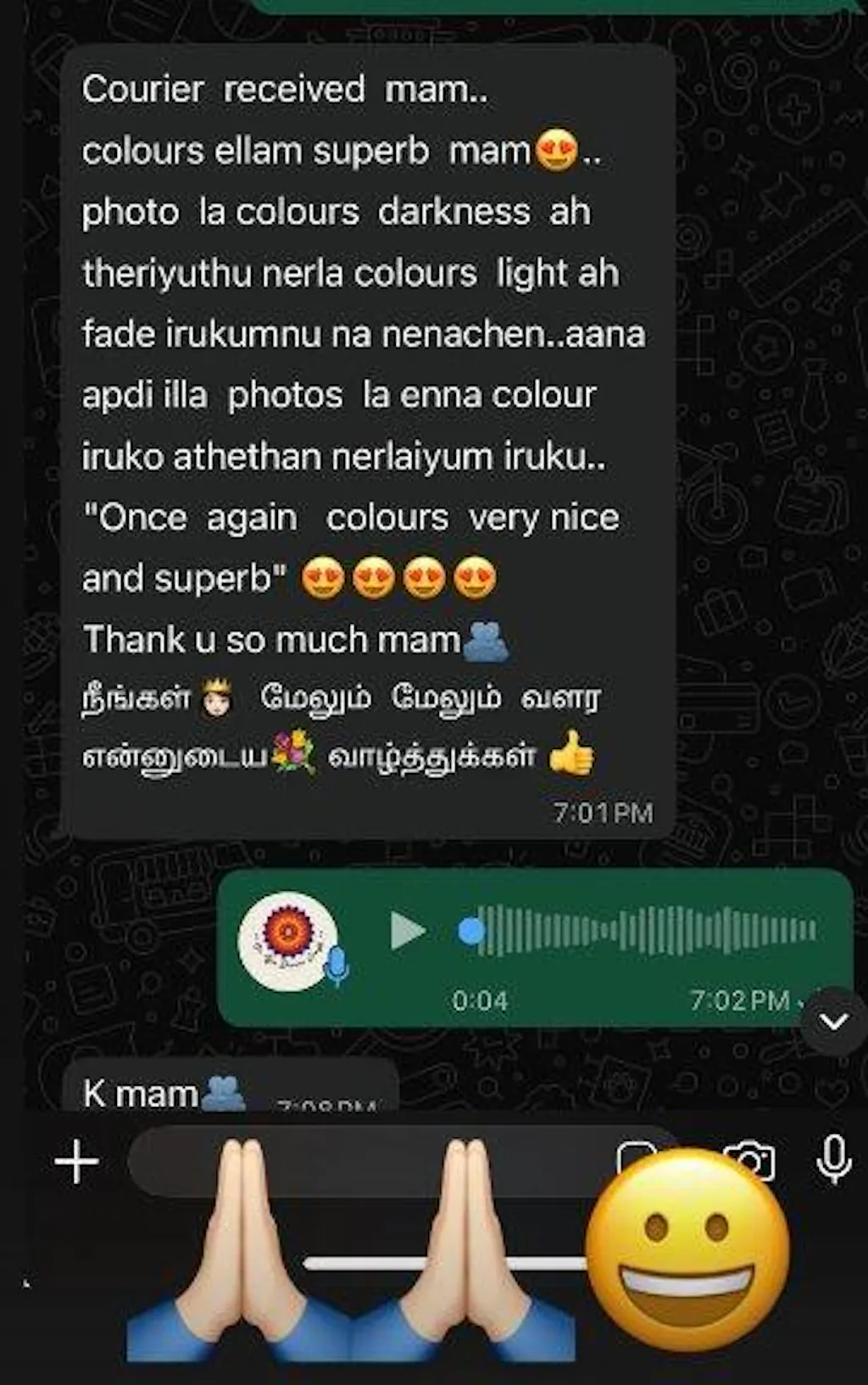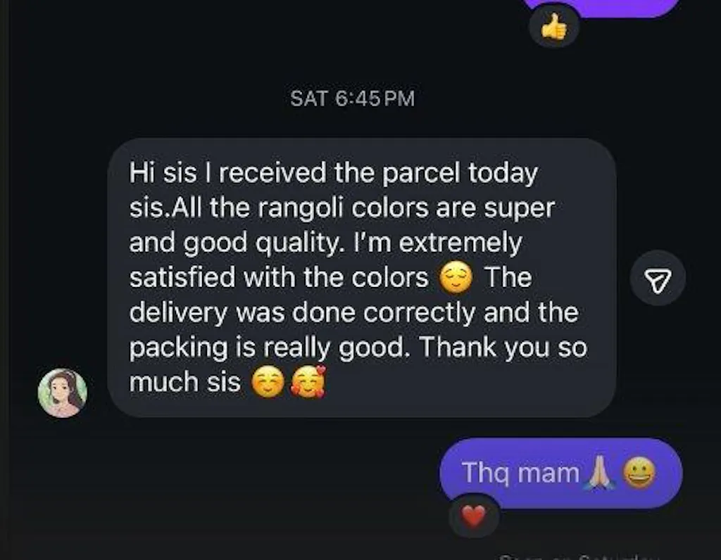 Hi sis I received the parcel today sis. All the rangoli colors are super and good quality. I'm extremely satisfied with the colors